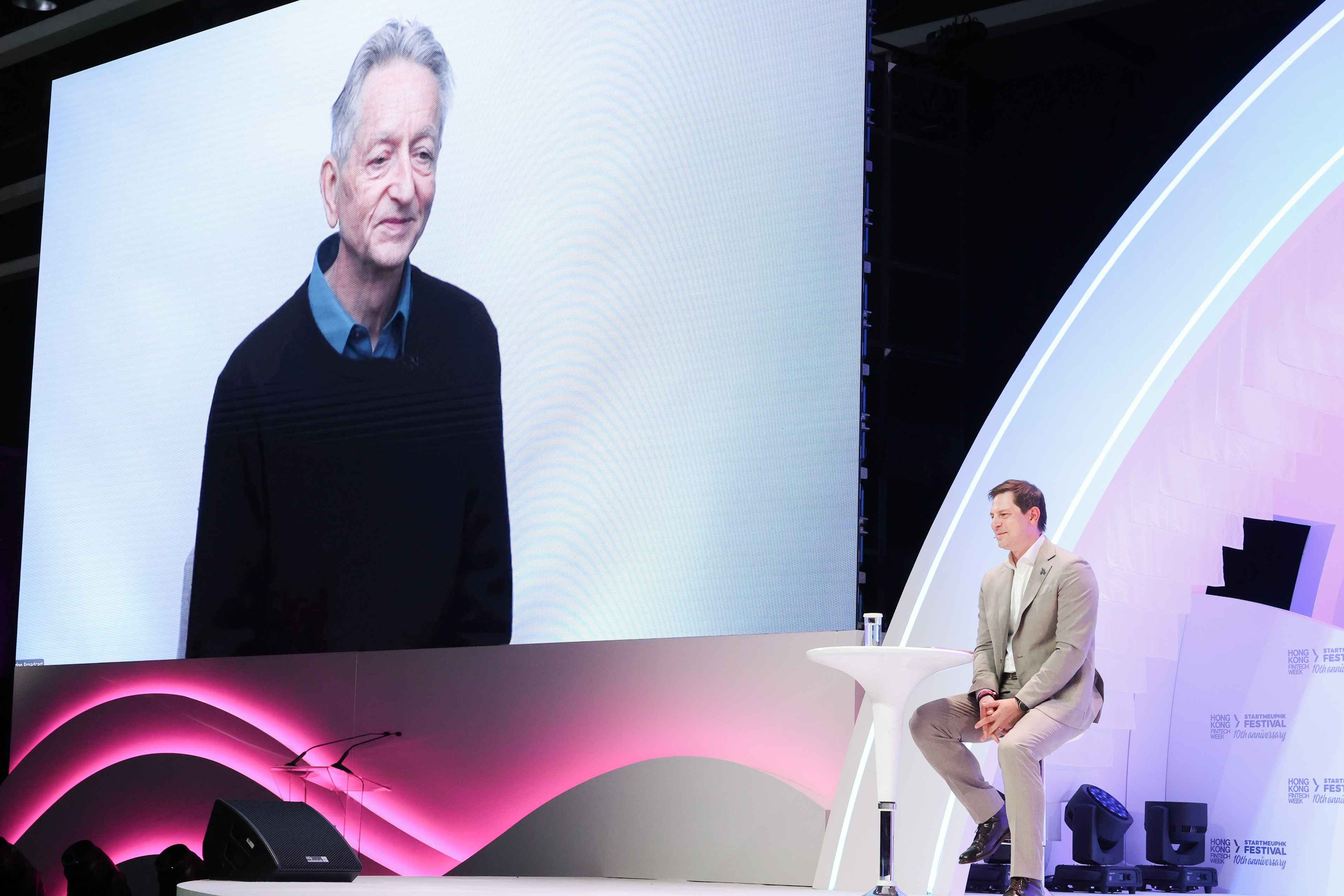 The Hong Kong FinTech Week x StartmeupHK Festival (HKFW x SMUF) 2025 concluded today (November 7). Photo shows Nobel Laureate in Physics, Professor Emeritus of the University of Toronto Mr Geoffrey Hinton sharing views via video conferencing at the HKFW x SMUF 2025 on November 3.