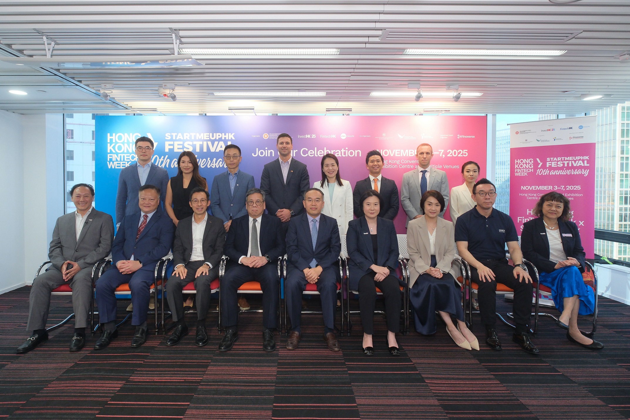 Invest Hong Kong (InvestHK) today (October 17) announced details of the Hong Kong FinTech Week x StartmeupHK Festival 2025. Photo shows (front row, from left) the Global Head of Financial Services, Fintech & Sustainability of InvestHK, Mr King Leung; the Associate Director, Policy and Legislation of the Insurance Authority, Mr Tony Chan; the Chief Fintech Officer of the Hong Kong Monetary Authority, Mr George Chou; the Secretary for Commerce and Economic Development, Mr Algernon Yau; the Secretary for Financial Services and the Treasury, Mr Christopher Hui; the Director-General of Investment Promotion of InvestHK, Ms Alpha Lau; the Director of Intermediaries and Head of Fintech Unit of the Securities and Futures Commission , Ms Elizabeth Wong ; the Group Chief Technology Officer of Hong Kong Exchanges and Clearing Limited, Mr John Hsu; and the Head of Startups of InvestHK, Ms Jayne Chan . Also present are (back row, from left) the General Manager of Strategic Development and Solutioning at Ant Digital Technologies, Mr Boz Wang ; the Head of Product and Strategy of ChinaAMC (HK), Ms Katie He; the Chief Digital Officer, Personal Banking and Wealth Management of Bank of China (Hong Kong), Mr Daniel Li; the Group Head of Innovation and Digital Partnerships of HSBC, Mr Bojan Obradović ; the Chief Operating Officer and Head of CEO Office of Standard Chartered Hong Kong, Ms Rose Kay; the Managing Director, Head of Hong Kong and Southeast Asia Intermediary Business of Invesco, Mr Ken Lin ; the CAO of Citi Hong Kong, Mr Chris Long; and the Co-Founder of Finoverse, Ms Vila Wong.