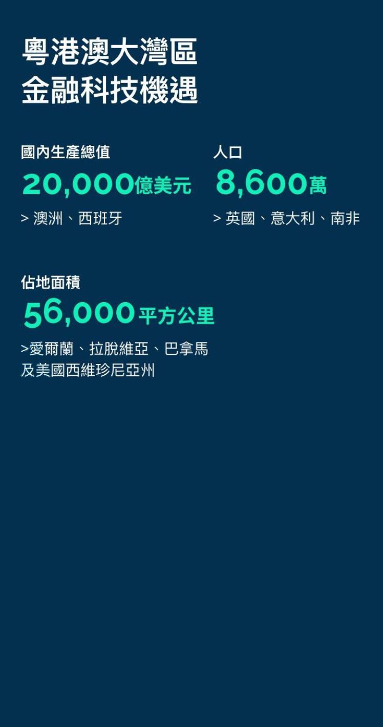香港將成為金融科技公司進駐粵港澳大灣區以擴大規模的跳板。大灣區市場發展迅速,更是連繫內地與海外市場的橋樑,將成為金融科技公司推動創新及擴充業務的理想平台,而結合金融專長與科技的香港,將成為區內的專業知識基地。